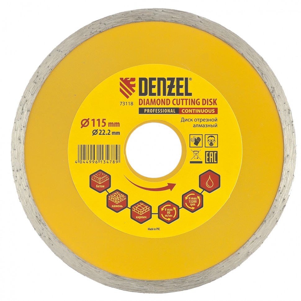 Алмазный диск 115х22,2х2,0мм DENZEL сплошной, для резки камня, кирпича, бетона.