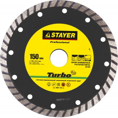 Алмазный диск 150х22,2мм STAYER "TURBO", сегментированный, сухая и влажная резка, для УШМ 3662-150