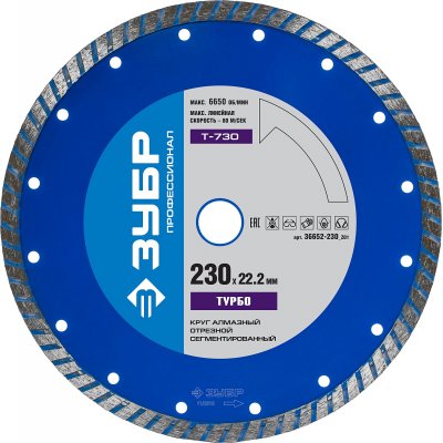 Алмазный диск 230х22,2мм ЗУБР "ПРОФИ" ТУРБО сегментированный, сухая и влажная резка 36652-230_z01