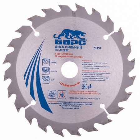 Пильный диск по дереву 160 x 20/16 мм, 24 твердосплавных зуба Барс