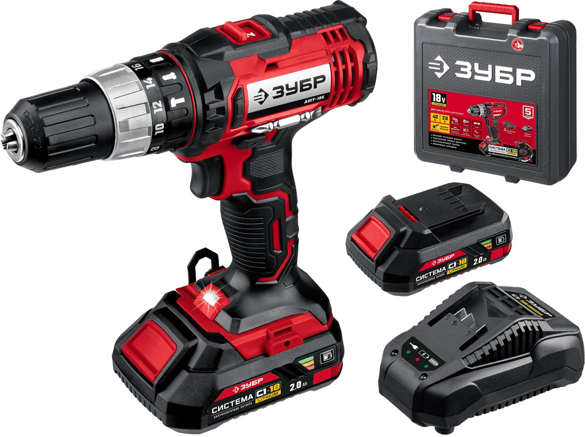 Дрель-шуруповерт ЗУБР 18В, 2 АКБ (2Ач), в кейсе, ударная