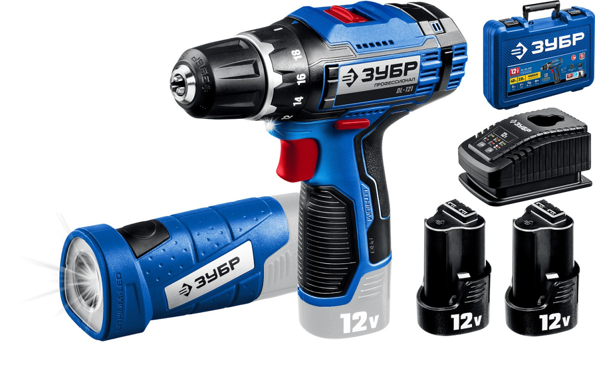Дрель-шуруповерт ЗУБР Т7, 12 В, 40 Нм, 2 АКБ (2 Ач) + LED фонарь, кейс, Профессионал DL-121-22F