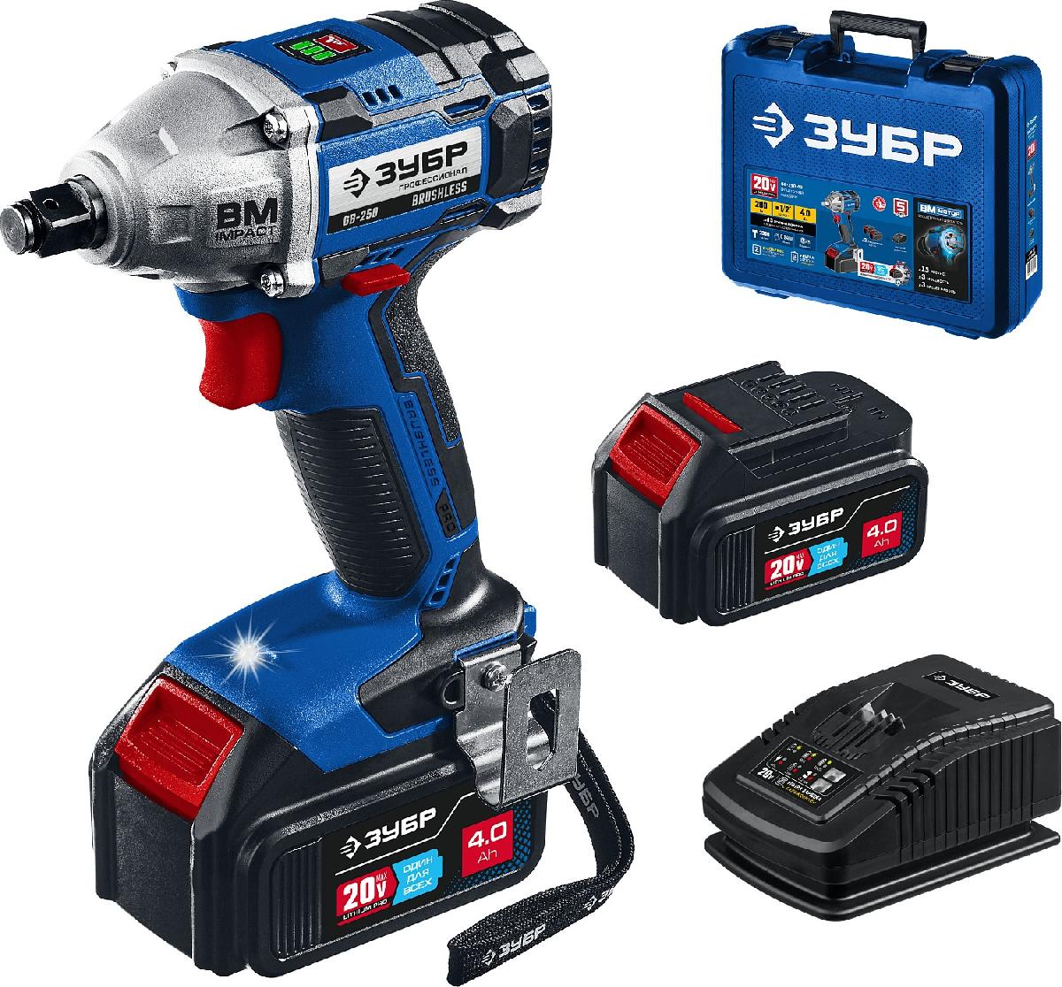 Гайковерт ЗУБР Т7, 20 В, 280 Н·м, 2 АКБ (4 А·ч), бесщеточный, кейс GB-250-42