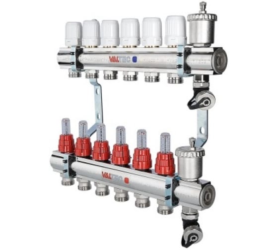 Коллекторный блок со встроенными расходомерами выпускается для распределения теплоносителя к потребителям в системах водяного отопления – радиаторам, конвекторам, петлям теплого пола, обогрева открытых площадок. Рабочая температура теплоносителя – до 90 градусов, давление – до 10 бар. На выходах прямого коллектора установлены настроечные клапаны с расходомерами, обратный коллектор оснащен термостатическими клапанами (ручные, с возможностью оборудования сервоприводами). Присоединение трубопроводов к выходам – по стандарту `евроконус`. Блок укомплектован также автоматическими воздухоотводчиками с отсекающими клапанами, дренажными кранами, сдвоенными крепежными кронштейнами. Материал коллекторов, корпусов арматуры – латунь CW617N (гальванопокрытие – никелирование), уплотнительных колец соединителей и золотников клапанов – EPDM