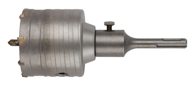 Коронка по бетону является сменным элементом для ударных дрелей и перфораторов. Применяется для сверления отверстий в бетоне, камне и кирпиче. Коронка изготовлена из хром-молибденовой стали и имеет твердосплавные резцы. В конструкции коронки предусмотрено сверло для центрирования. Имеет хвостовик SDS-plus. При установке в патрон хвостовик необходимо смазывать.