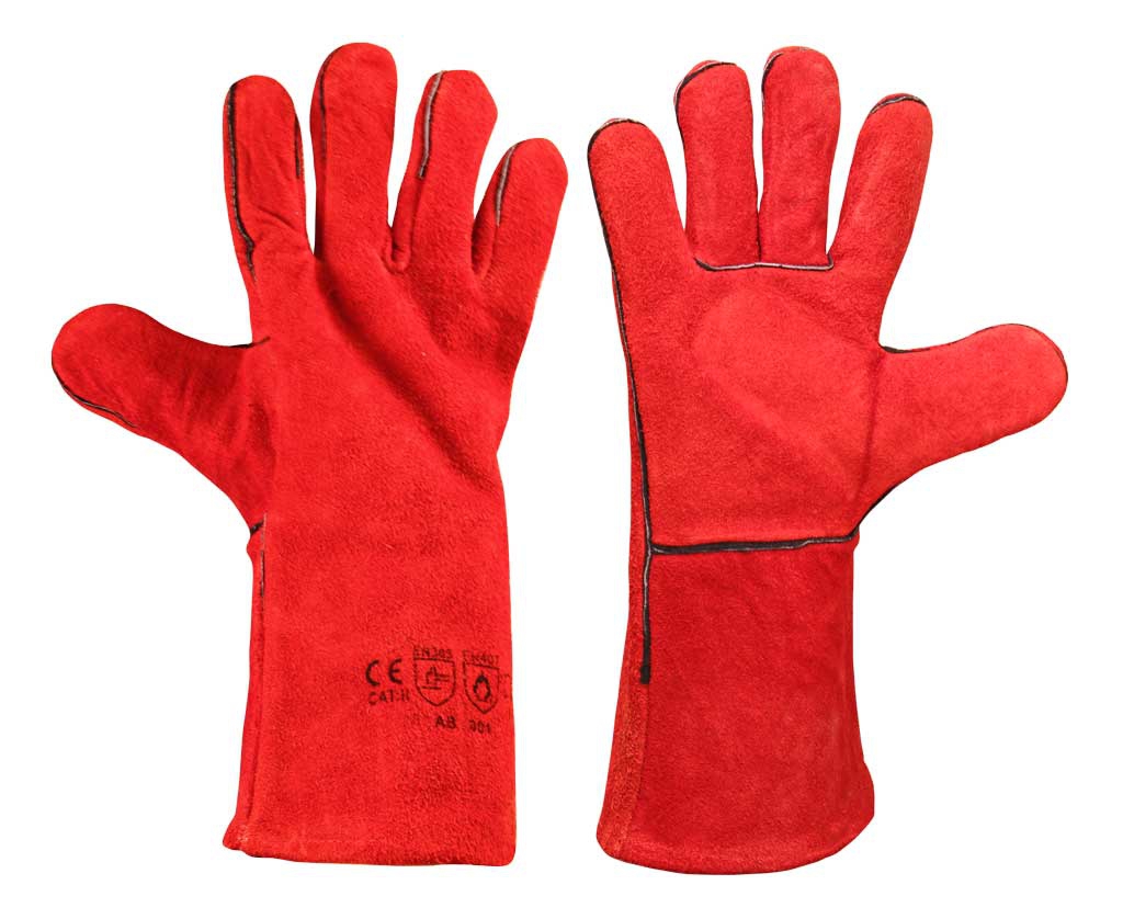 Краги из спилка сорта ВС , пятипалые, красного цвета.
