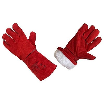 Краги из качественного спилка (толщина 1,2мм), пятипалые, красного цвета. Швы усилены кожаными вставками.