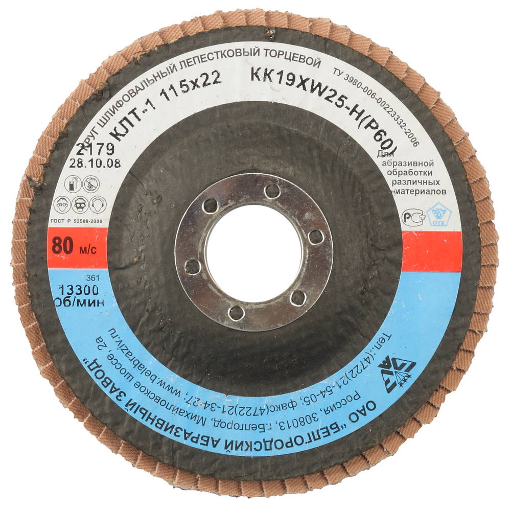 Круг лепестковый торцевой "БАЗ" для шлифования, тип КЛТ 1, KK19XW, зерно-электрокорунд нормальный, P60, 115 х 22 мм