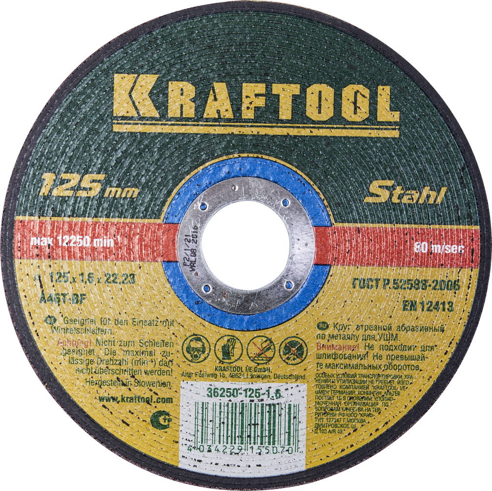 Круг отрезной абразивный KRAFTOOL по металлу, для УШМ, 125x1,6x22,23мм