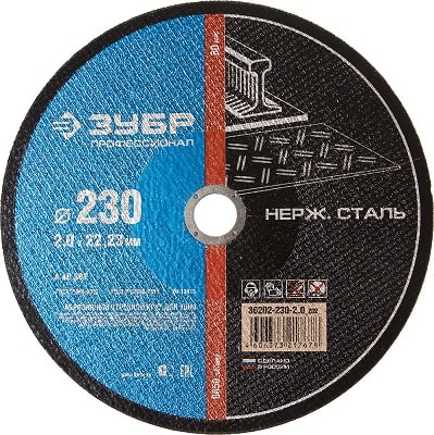 Круг отрезной абразивный ЗУБР "ПРОФЕССИОНАЛ" по нержавеющей стали, 230ммх2,0ммх22,23мм 36202-230-2.0