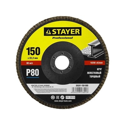 Круг шлифовальный STAYER "PROFI" лепестковый торцевой, зерно-электрокорунд нормальный, тип КЛТ 1, P80, 150х22,2мм