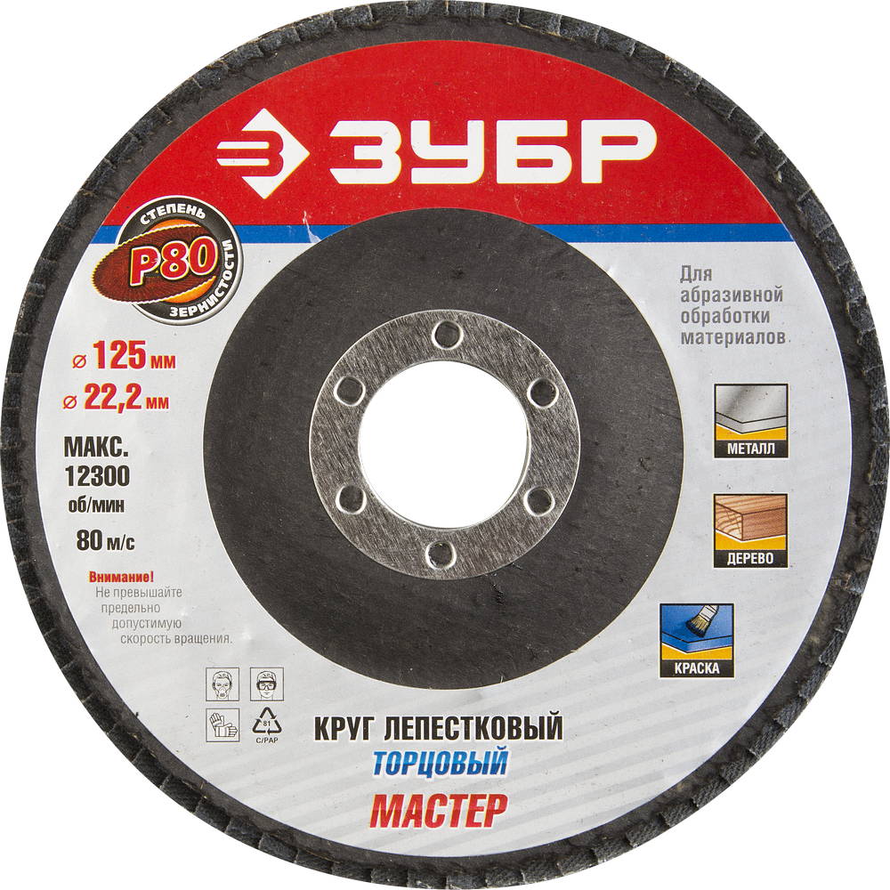 Круг шлифовальный ЗУБР "ЭКСПЕРТ" лепестковый торцевой, тип КЛТ 1, зерно-электрокорунд нормальный, P80, 125х22,2мм