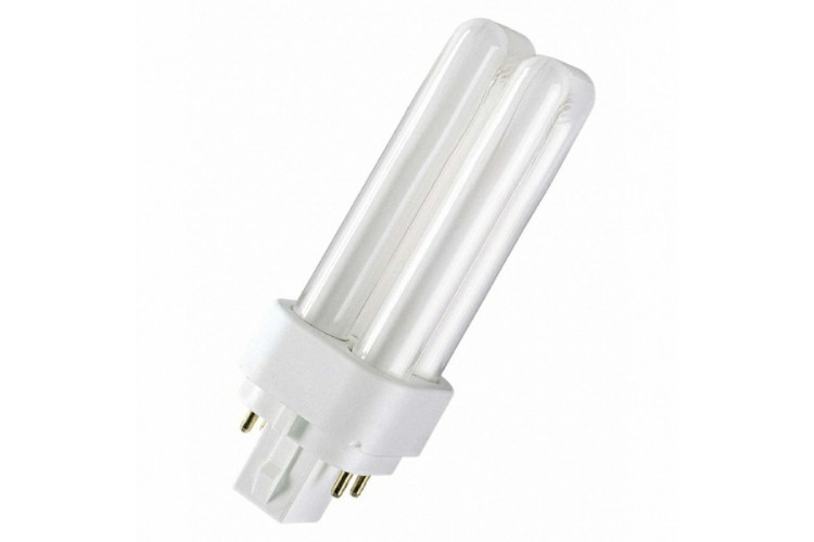 Компактная люминесцентная лампа неинтегрированная OSRAM DULUX D/E 26Вт с штырьковым одиночным четырехконтактным цоколем G24Q-2 и двухоборотными колбами. Лицензиатом торговой марки OSRAM в общем освещении является компания LEDVANCE
