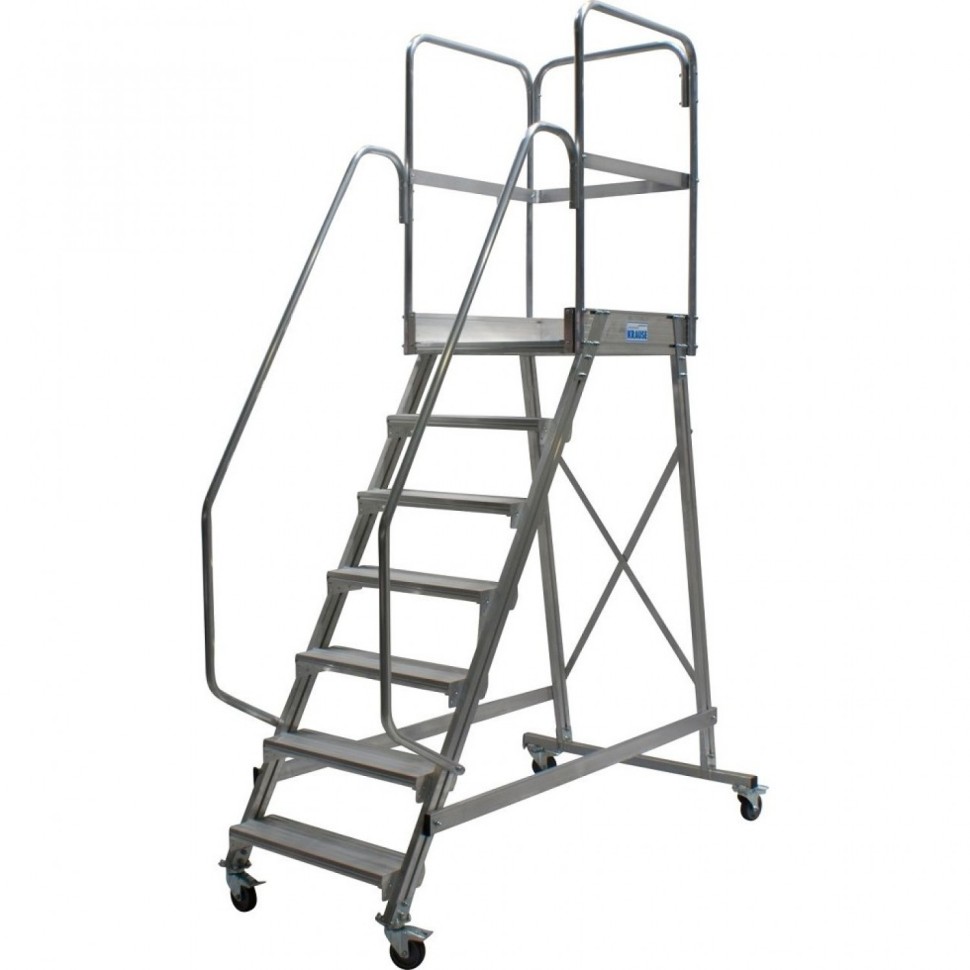 Большая площадка 700х600 мм, и компактная конструкция делают лестницу удобной для использования на ограниченных площадях. Широкие ступени 175 мм предназначены для максимальных удобства и безопасности при подъёме. Двухсторонние перила на подъёмной части входят в комплектацию. Трёхстороннее ограждение площадки высотой 1,05 м с защитной планкой на уровне колен и плинтусом. 4 поворотных, оборудованных тормозами ролика с прорезиненным покрытием для мягкого хода. Все соединения произведены заклёпочным или болтовым способом, что позволяет производить замену отдельных деталей. Поставка осуществляется в предварительно собранных модулях. Продукт сертифицирован в строгом соответствии с ГОСТ 24258-92