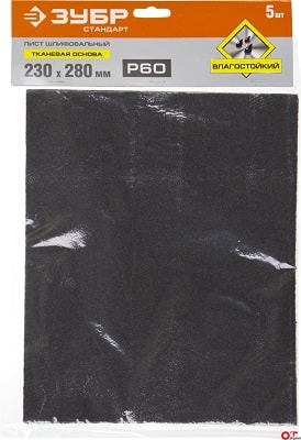 Лист шлифовальный ЗУБР "СТАНДАРТ" на тканевой основе, водостойкий 230х280мм, Р60, 5шт