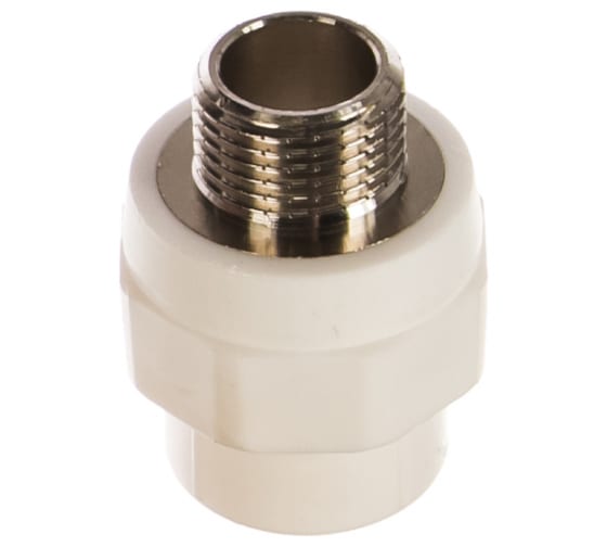 Прямой полипропиленовый фитинг для соединения полипропиленовой трубы и компонента инженерной системы с резьбовым подключением. Резьба фитинга – наружная трубная по ГОСТу 6357. Предусмотрен участок корпуса шестигранной формы, под гаечный или трубный рычажный ключ