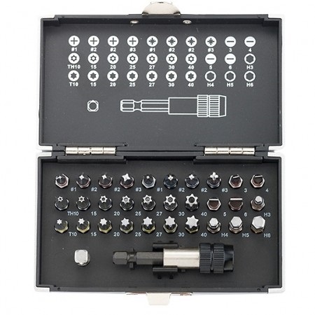 В наборе 30 бит со шлицами PH1, PH2, PH3, PZ1, PZ2, PZ3, T10, T15, T20, T25, T27, T30, T40, H3, H4, H5, H6, SL3, SL4, SL5, SL6, ТН10, ТН15, ТН20, ТН25, ТН27, ТН30 и ТН40, которые являются наиболее востребованными при проведении различных работ.