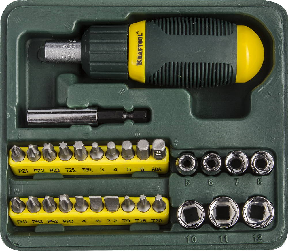 Набор KRAFTOOL Отвертка реверсивная с битами и торцовыми головками, 29 предметов