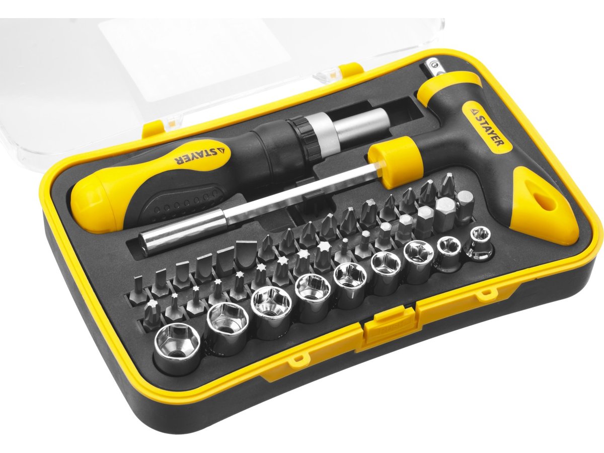 Набор STAYER "MASTER" "ТECHNO": Отвертки реверсивная, Т-образная отвертка-битодержатель, адаптер для торц голов,43предм