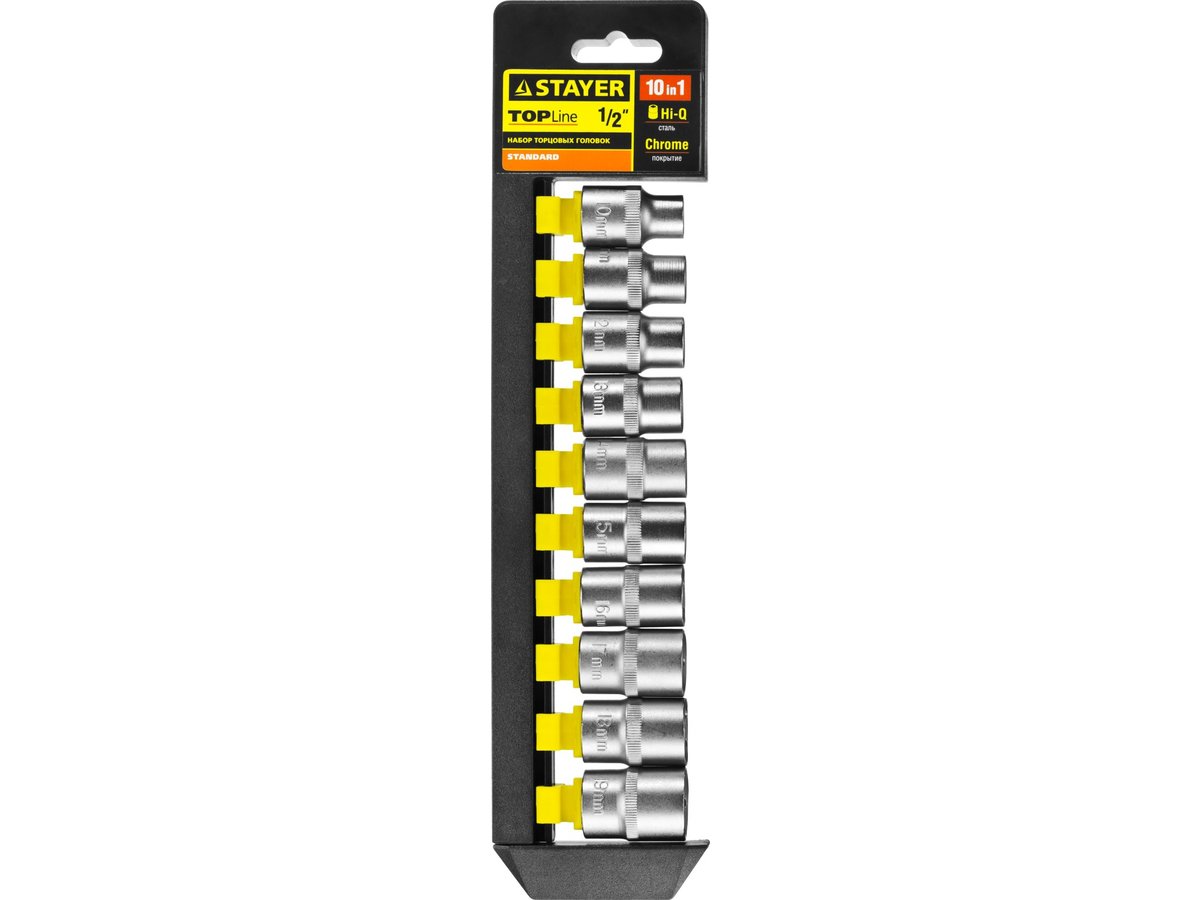 Набор STAYER "STANDARD": Торцовые головки (1/2") на пластиковом рельсе, 10-19мм, 10 предметов