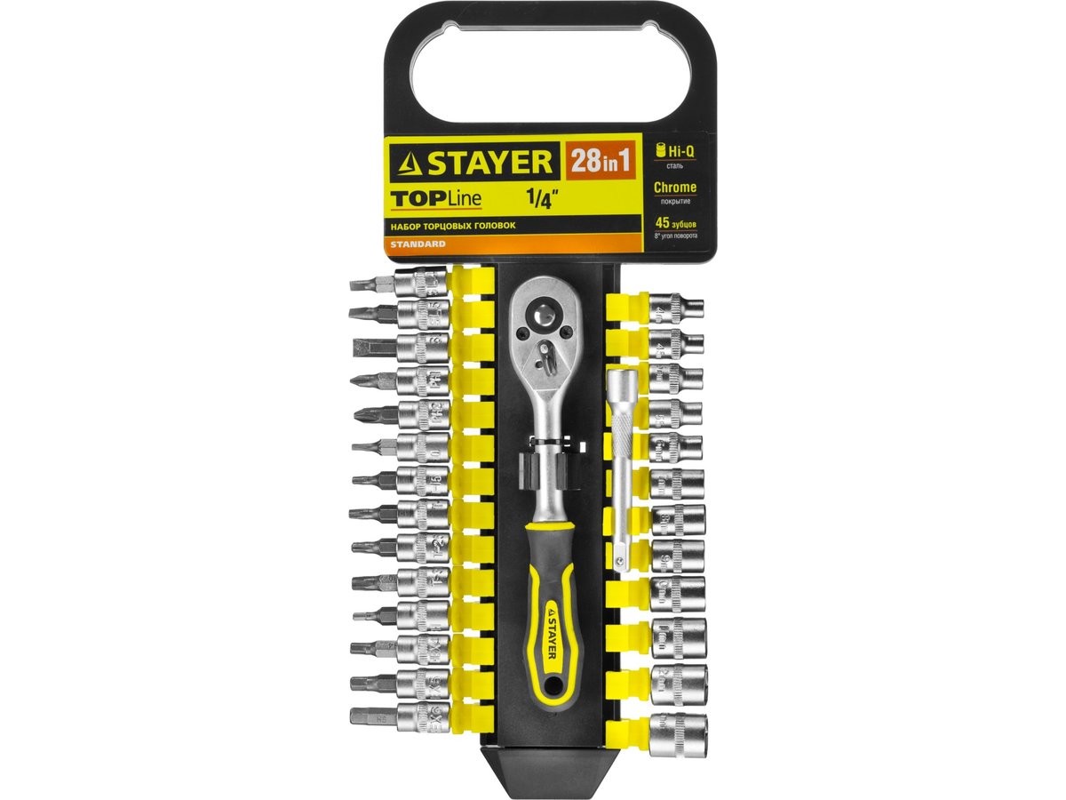 Набор STAYER "STANDARD": Торцовые головки, биты-головки (1/4") на пластик рельсе, трещотка, удл-тель, 4-13мм, 28 пр.