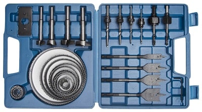-Комплектация: 13 коронок по дереву: 19,22,25,29,35,44,51,57,67,76,89,102,127 , державка , опорное основание, ключ имбусовый, перьевые сверла - 4 шт: 12, 22, 25, 30