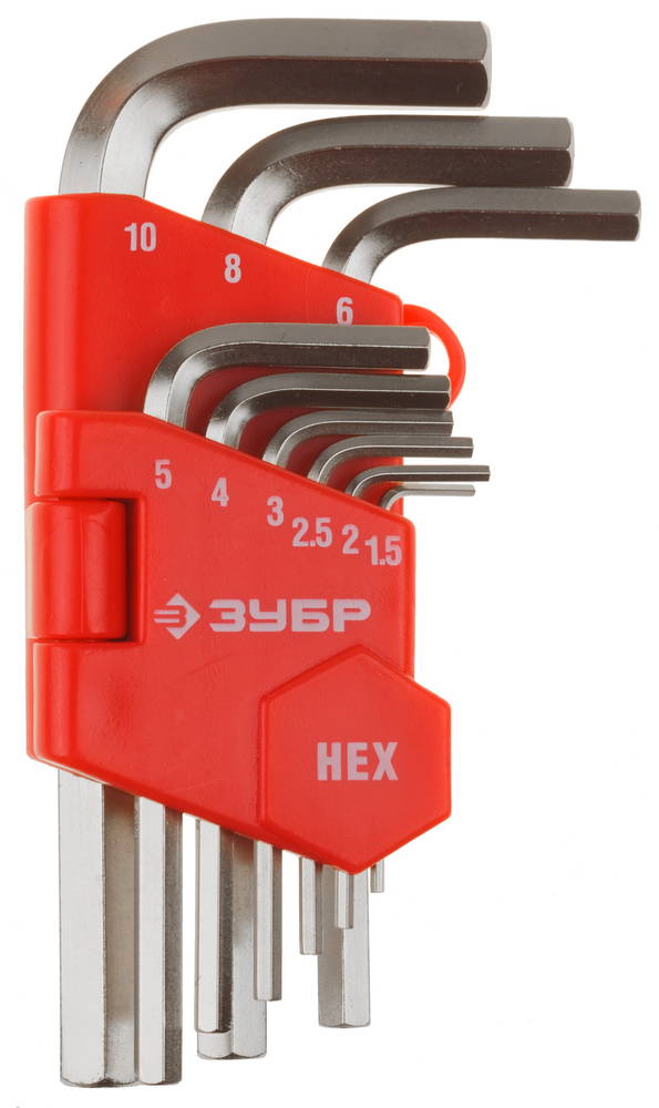 Набор ЗУБР Ключи "МАСТЕР" имбусовые короткие, Cr-V, сатинированное покрытие, пластик. держатель, HEX 1,5-10мм, 9 пред