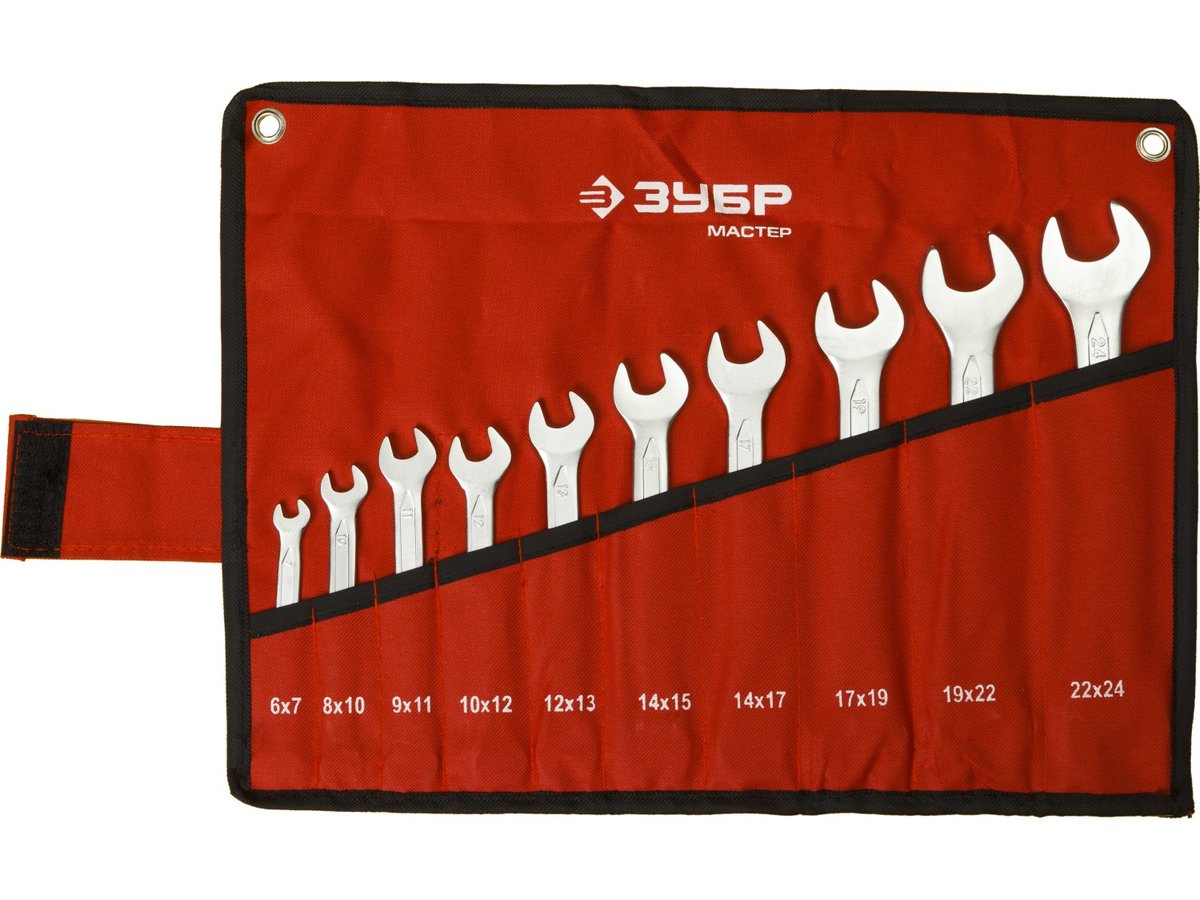 Набор ЗУБР "МАСТЕР": Ключ гаечный рожковый, Cr-V сталь, хромированный, 6-24мм, 10шт 27010-H10
