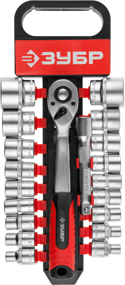 Набор ЗУБР "МАСТЕР": Торцовые головки (1/2") на пластиковом рельсе, трещотка, удлинитель, Cr-V, 8-32мм, 20 предметов