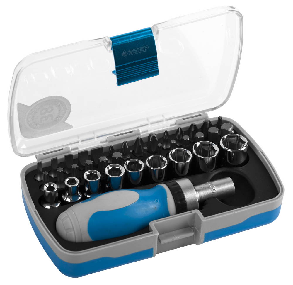 Набор ЗУБР Отвертка "ЭКСПЕРТ" реверс.с насадками, 2-хкомпон. ручка, HEX1/4" - SQ1/4",в пласт. боксе, 38 пред.