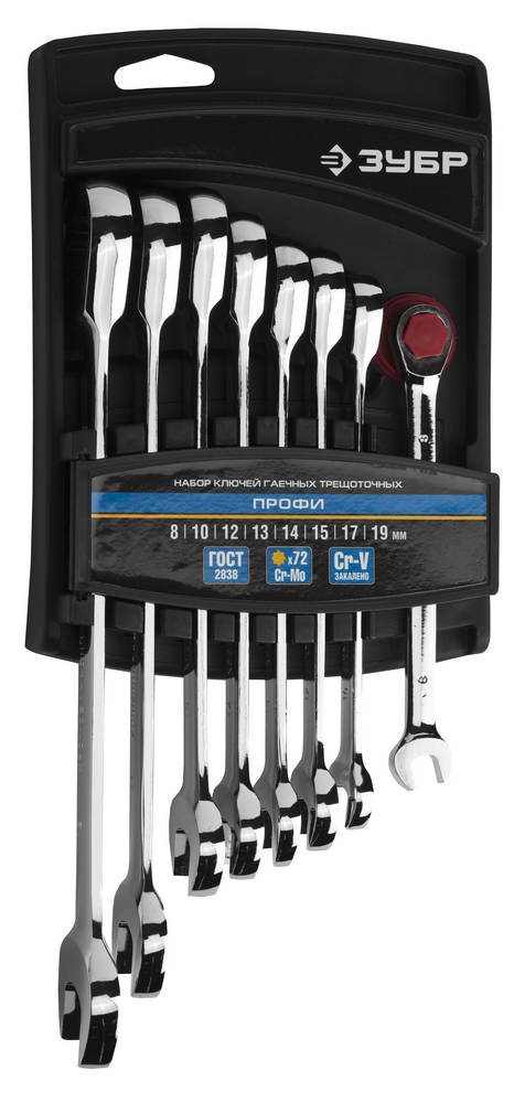 Набор ЗУБР "ПРОФИ": Ключ гаечный комбинированный трещоточный, Cr-V сталь, хромированный, 8-19мм, 8шт