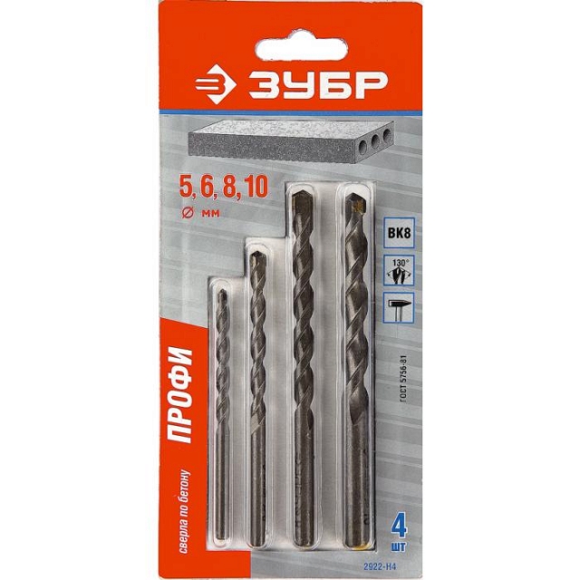 Набор ЗУБР Свёрла "МАСТЕР" по бетону, ударные, 4; 5; 6; 8; 10мм, 5шт 2922-H5