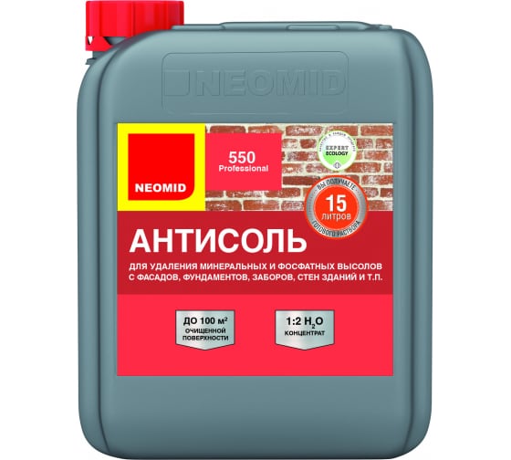 "NEOMID 550" предназначен для удаления минеральных высолов различного происхождения и состава с кирпича, природного и искусственного камня, бетона и т.п.