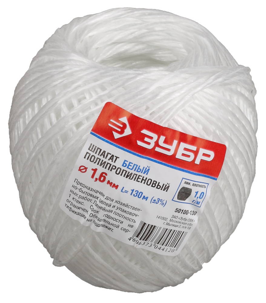 Шпагат ЗУБР полипропиленовый, d=1,6 мм, 130 м, белый, 22 кгс, 1,0 ктекс