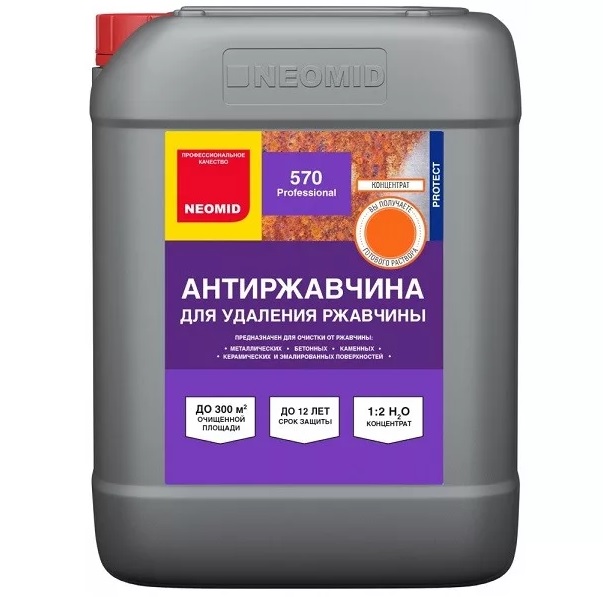 "NEOMID 570" предназначен для удаления ржавчины с металлических, бетонных, эмалированных и каменных поверхностей. Останавливает и предотвращает коррозионное разрушение. Может использоваться для подготовки поверхности металлов перед нанесением порошковых или жидких лакокрасочных покрытий. После применения препарата на поверхности металла образуется плотная защитная пленка из нерастворимых в воде комплексных соединений, обеспечивающая высокую защиту от коррозии на срок до 12 лет, при условии последующего покрытия основания соответствующим лакокрасочным составом. Средство повышает адгезию краски к оцинкованным и другим металлическим поверхностям.