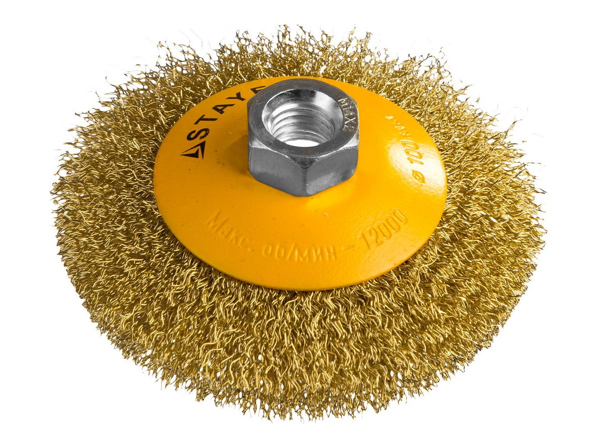 STAYER "PROFESSIONAL". Щетка коническая для УШМ, витая стальная латунированная проволока 0,3мм, 100ммхМ14