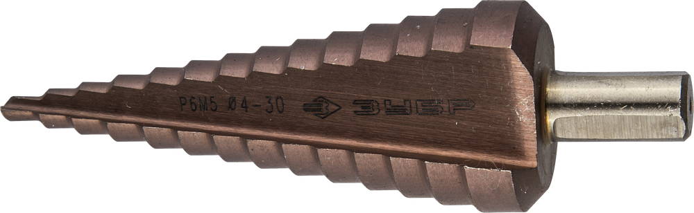 Сверло ЗУБР "КОБАЛЬТ" ступен. по сталям, цв.мет.ст.Р6М5 с кобальт.покрыт.d4-30 мм,14ст.d4-30, L-100мм, трехгр.хв. 10мм