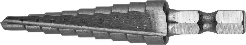 Сверло ЗУБР ступенчатое по сталям и цвет.мет.ст. Р6М5,d 4-12мм, 9ступ.d 4-12, L- 65 мм,шестигран. хвост.1/4"