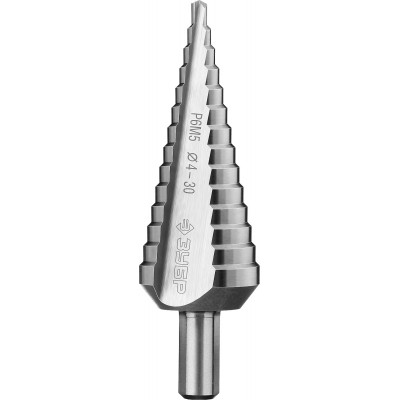 Сверло ЗУБР ступенчатое по сталям и цвет.мет. ст.Р6М5, d4-30мм, 14ступ.d.4-30, L-100мм, трехгран. хв.10мм