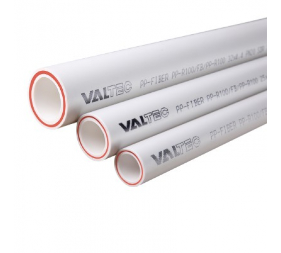 Труба из полипропилена PP-R 100, армированная стекловолокном, для систем питьевого и хозяйственно-питьевого холодного водоснабжения, горячего водоснабжения, водяного отопления, а также технологических трубопроводов, транспортирующих жидкости и газы, неагрессивные к материалам трубы. Классы эксплуатации по ГОСТ 32415-2013 – 1, 2, 4, 5, ХВ. Максимально допустимое рабочее давление при температуре теплоносителя 90 градусов – 6 бар, при транспортировке холодной воды – 20 бар. Ассортимент VALTEC включает в себя трубы PP-FIBER PN 20 с наружным диаметром от 20 до 110 мм. Технология монтажа трубопроводов – полифузионная сварка