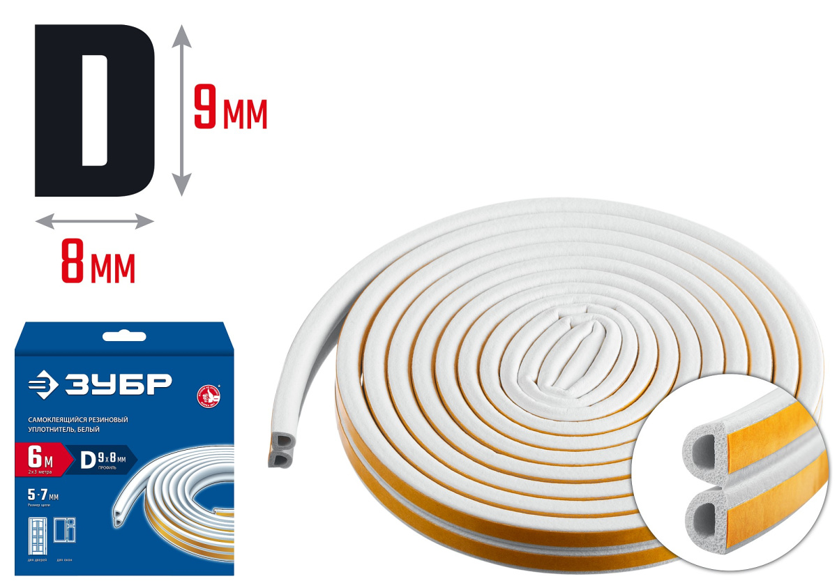 Уплотнитель ЗУБР резиновый самоклеящийся, профиль "D", белый, 6м