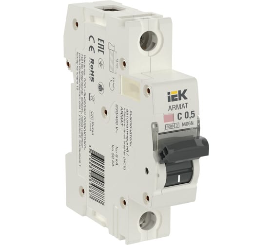 Автоматические выключатели ARMAT серии M06N предназначены для защиты цепей от перегрузки и короткого замыкания. Модельный ряд включает в себя устройства с характеристиками срабатывания B, C, D и номинальными токами от 0,5 до 63 А. Номинальная отключающая способность автоматических выключателей ARMAT серии M06N составляет 6 кА. Предельная отключающая способность варьируется в зависимости от номинала от 10 до 50 кА